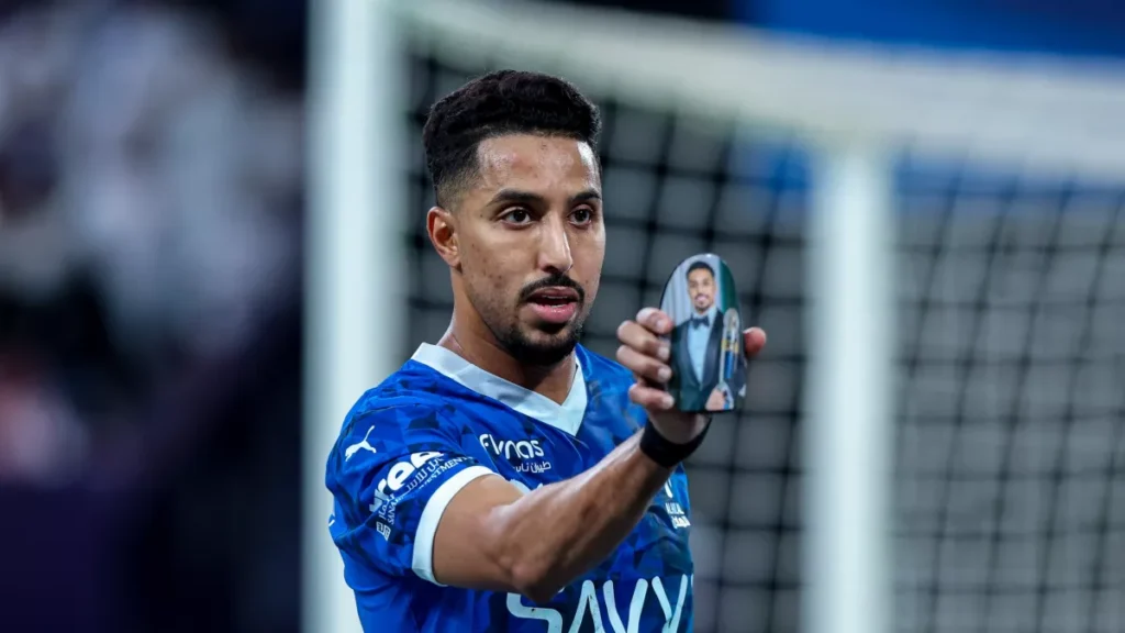 وأخرج سالم الدوسري واقي الساق الخاص به وأظهره إلى الكاميرات في ملعب المملكة أرينا.