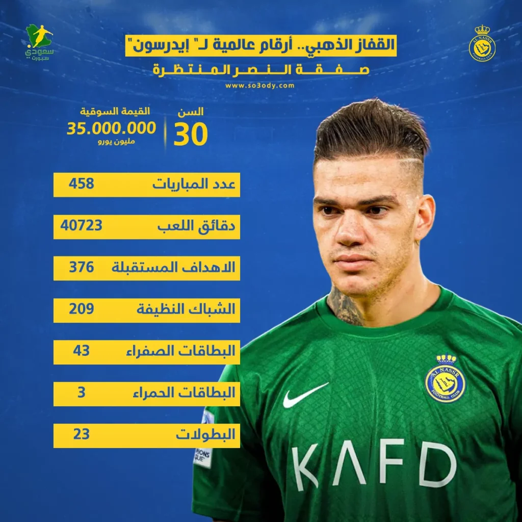 ويٌعد الحارس البرازيلي لفريق مانشستر سيتي الإنجليزي، إيدرسون مورايش أحد أهم اللاعبين المنتظرين داخل قلعة نادي النصر، جماهيرياً وإدارياً، بعد تقارير مؤكدة عن اقتراب الصفقة بشكل رسمي.