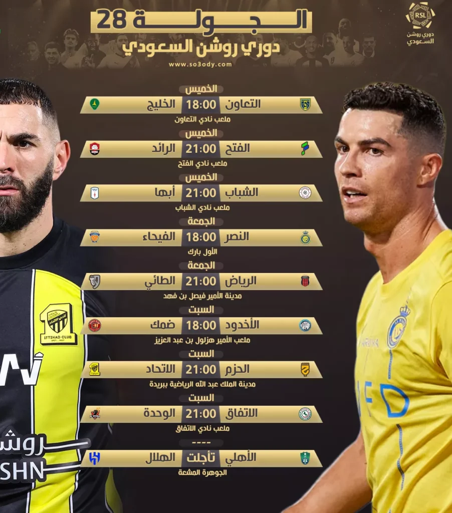 تستعد جماهير ومتابعي دوري روشن السعودي للمحترفين، لانطلاق الجولة 28 من المسابقة، والتي تقام غدا الخميس، بإقامة 3 مباريات.