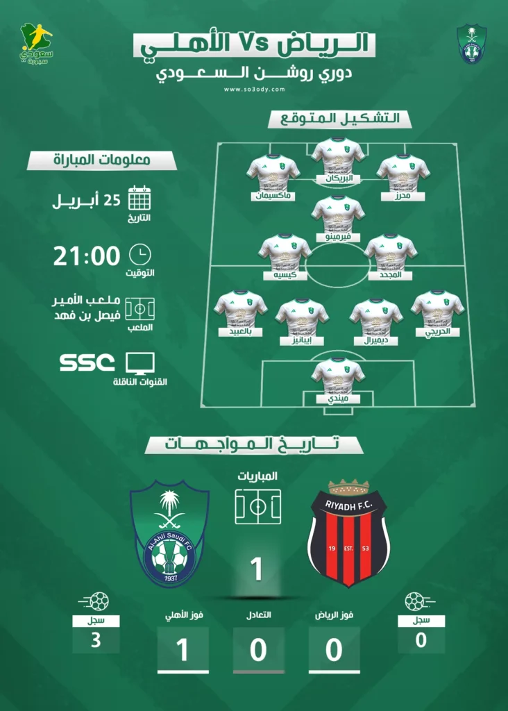 ومن المقرر أن يتم بث مباراة الرياض والأهلي، عبر فضائية SSC1 بتعليق حماد العنزي ورؤوف خليف.