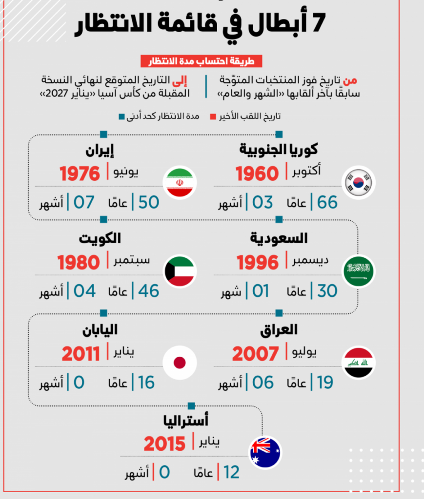 زاد تتويج المنتخب القطري الأول لكرة القدم، بلقب كأس آسيا للمرة الثانية على التوالي، مدة انتظار الأبطال القاريين السابقين، الذين دخلوا فترة جديدة مدتها 3 أعوام، قبل الحصول على فرصة أخرى في النسخة المقبلة على الملاعب السعودية، والمقرر تنظيمها يناير 2027.
