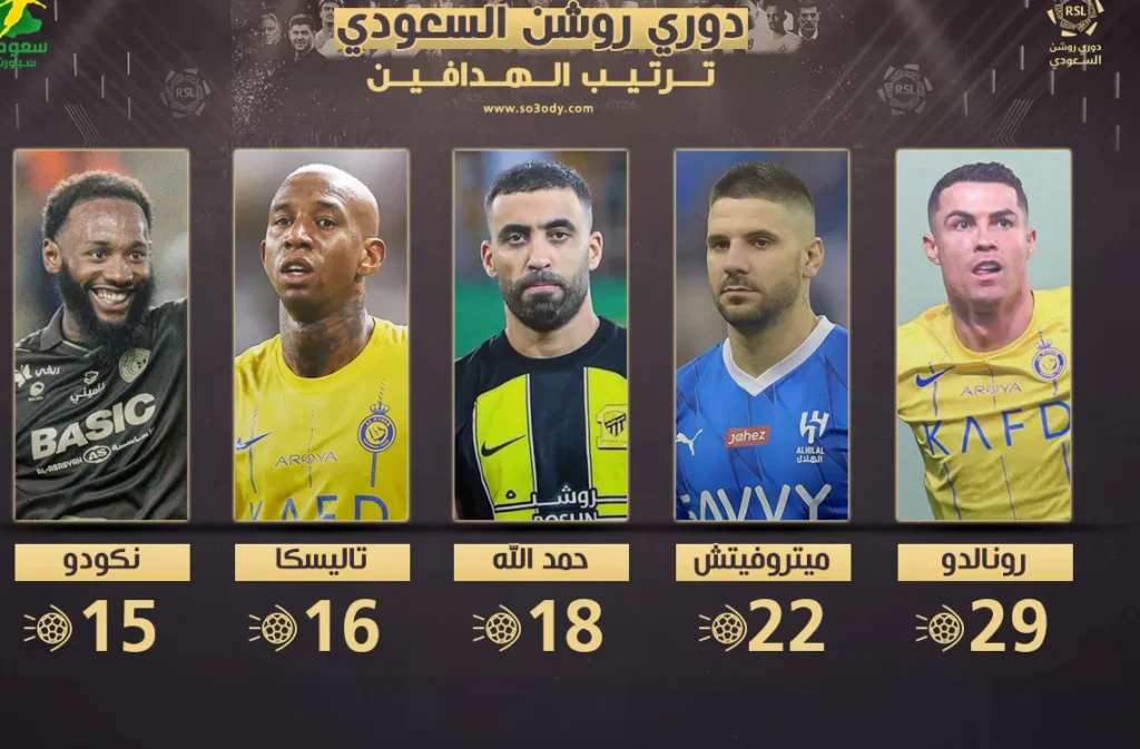 يتصدر كريستيانو رونالدو، جدول ترتيب الهدافين في الدوري السعودي برصيد 29 هدف، ويلاحقه ميتروفيتش مهاجم الهلال في المركز الثاني برصيد 22 هدف.