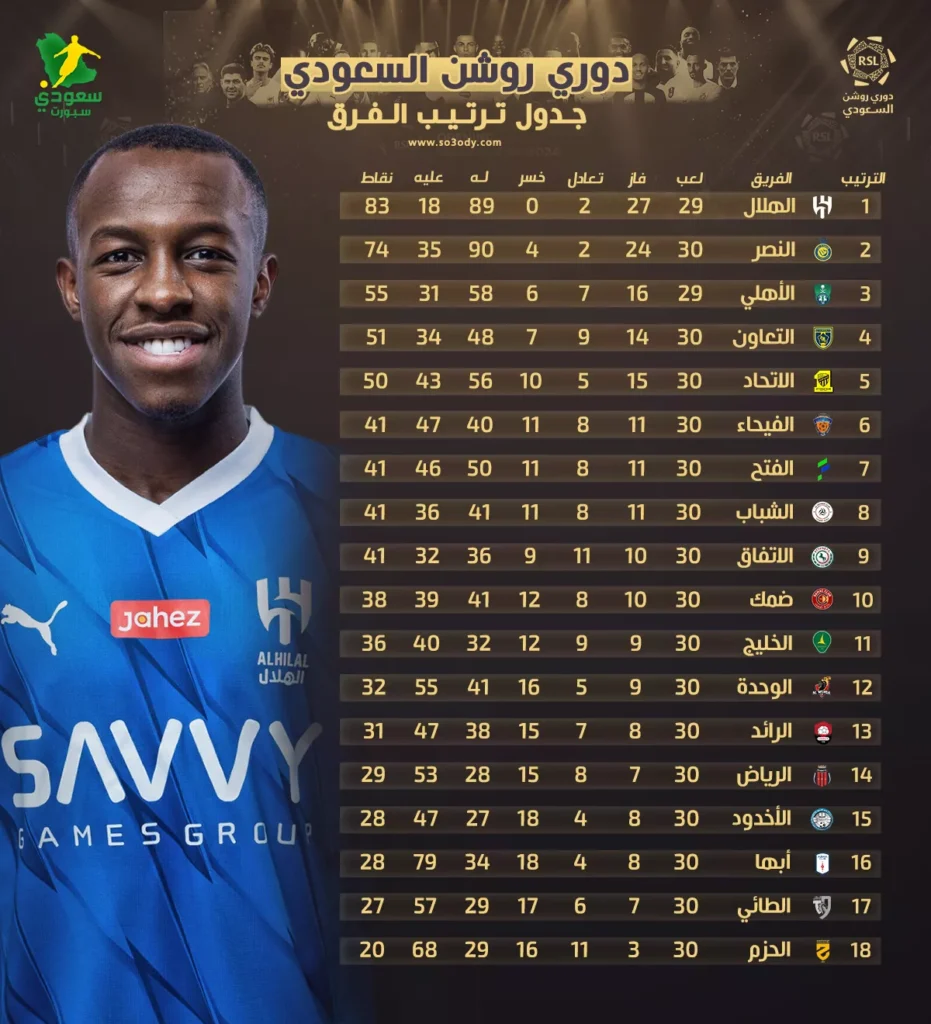 انتهت الجولة رقم 30 من مسابقة دوري روشن لكرة القدم لهذا الموسم، ولا يزال نادي الهلال متصدرًا للبطولة برصيد 83 نقطة.