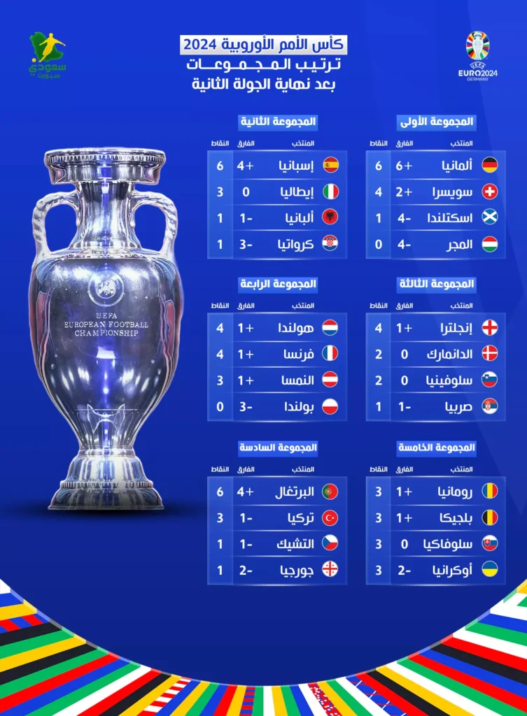 ترتيب المجموعات في يورو 2024 بعد انتهاء الجولة الثانية: