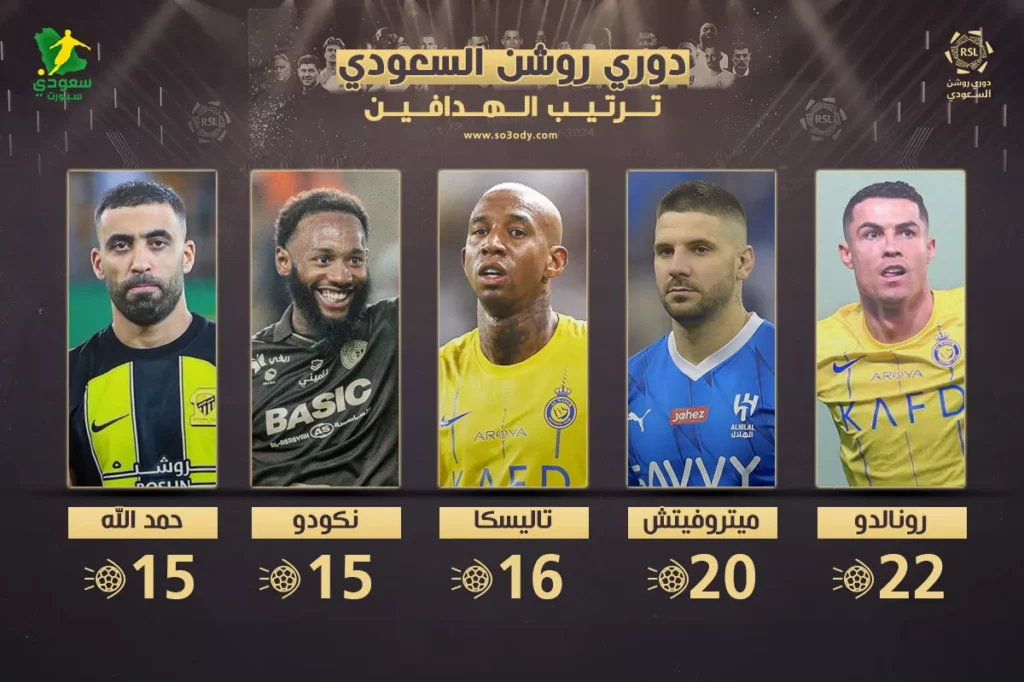 ويتصدر كريستيانو رونالدو مهاجم نادي النصر جدول ترتيب هدافي دوري روشن السعودي، برصيد 22 هدف، بينما يحتل ألكسندر ميتروفيتش مهاجم الهلال المركز الثاني بـ 20 هدف.