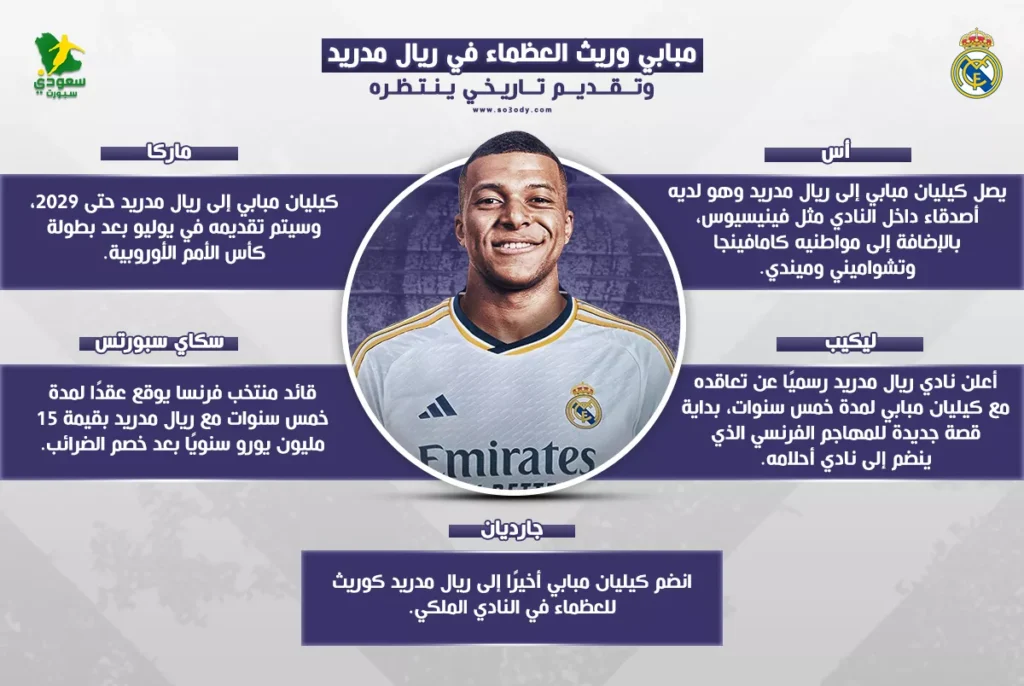 أعلن نادي ريال مدريد رسميًا عن تعاقده مع كيليان مبابي لمدة خمس سنوات، بداية قصة جديدة للمهاجم الفرنسي الذي ينضم إلى نادي أحلامه.