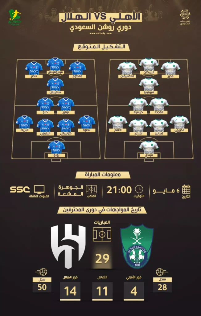 تترقب جماهير كرة القدم العربية، والسعودية بشكل خاص، المواجهة الكبرى في دوري روشن السعودي للمحترفين، بإقامة كلاسكيو المملكة، الذي يجمع الأهلي، على ملعبه ووسط جماهيره، بنادي الهلال، في اللقاء المؤجل من الأسبوع 28.