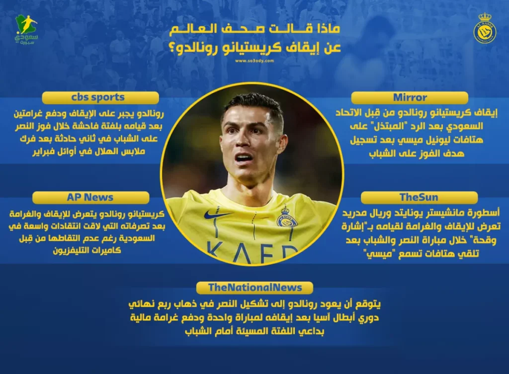 رونالدو يجبر على الإيقاف ودفع غرامتين بعد قيامه بلفتة فاحشة خلال فوز النصر على الشباب في ثاني حادثة بعد فرك ملابس الهلال في أوائل فبراير.