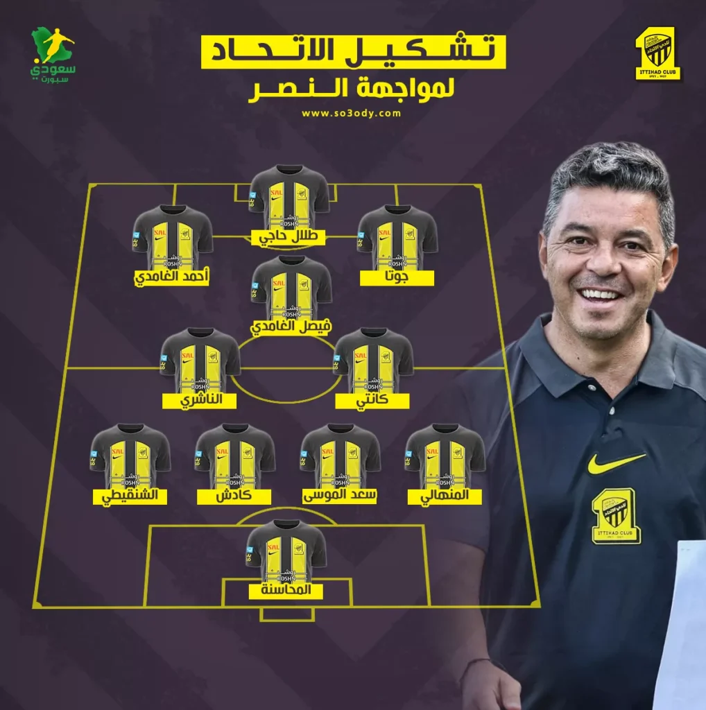أعلن الأرجنتيني مارسيلو جاياردو، المدير الفني للفريق الأول لكرة القدم بنادي الاتحاد، عن التشكيل الرسمي لمواجهة النصر، في ختام منافسات مسابقة الدوري السعودي للمحترفين.