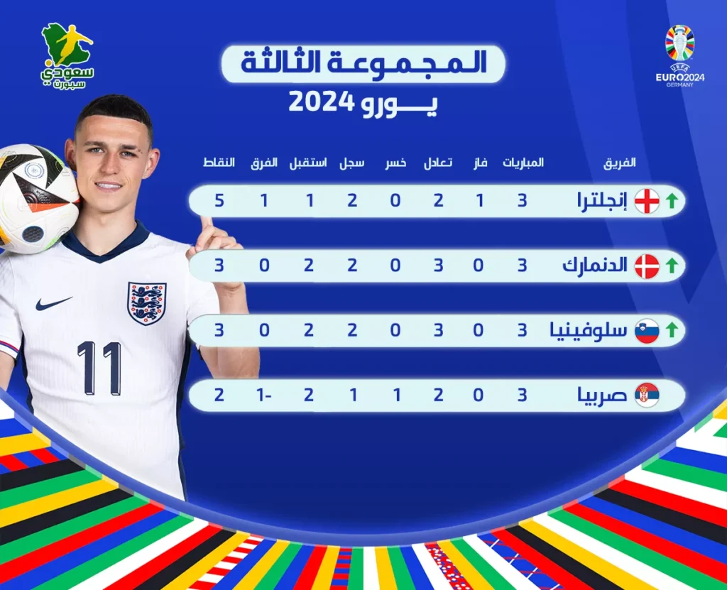 وفي الترتيب الثالث يتواجد المنتخب السلوفيني برصيد 3 نقاط بالتعادل مع إنجلترا وصربيا والدنمارك.